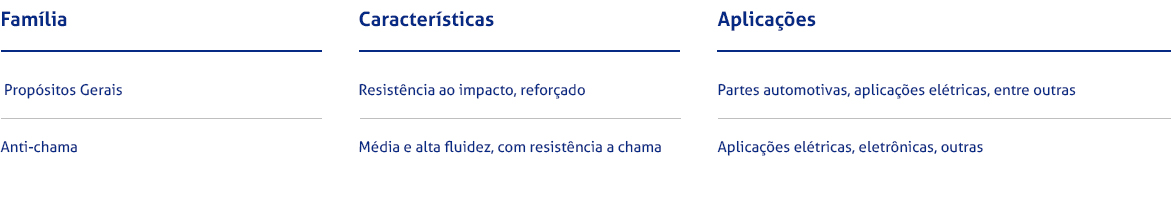 Reforçado com fibra, aditivado para resistência a chama. Aplicações: Produtos elétricos e eletrônicos.